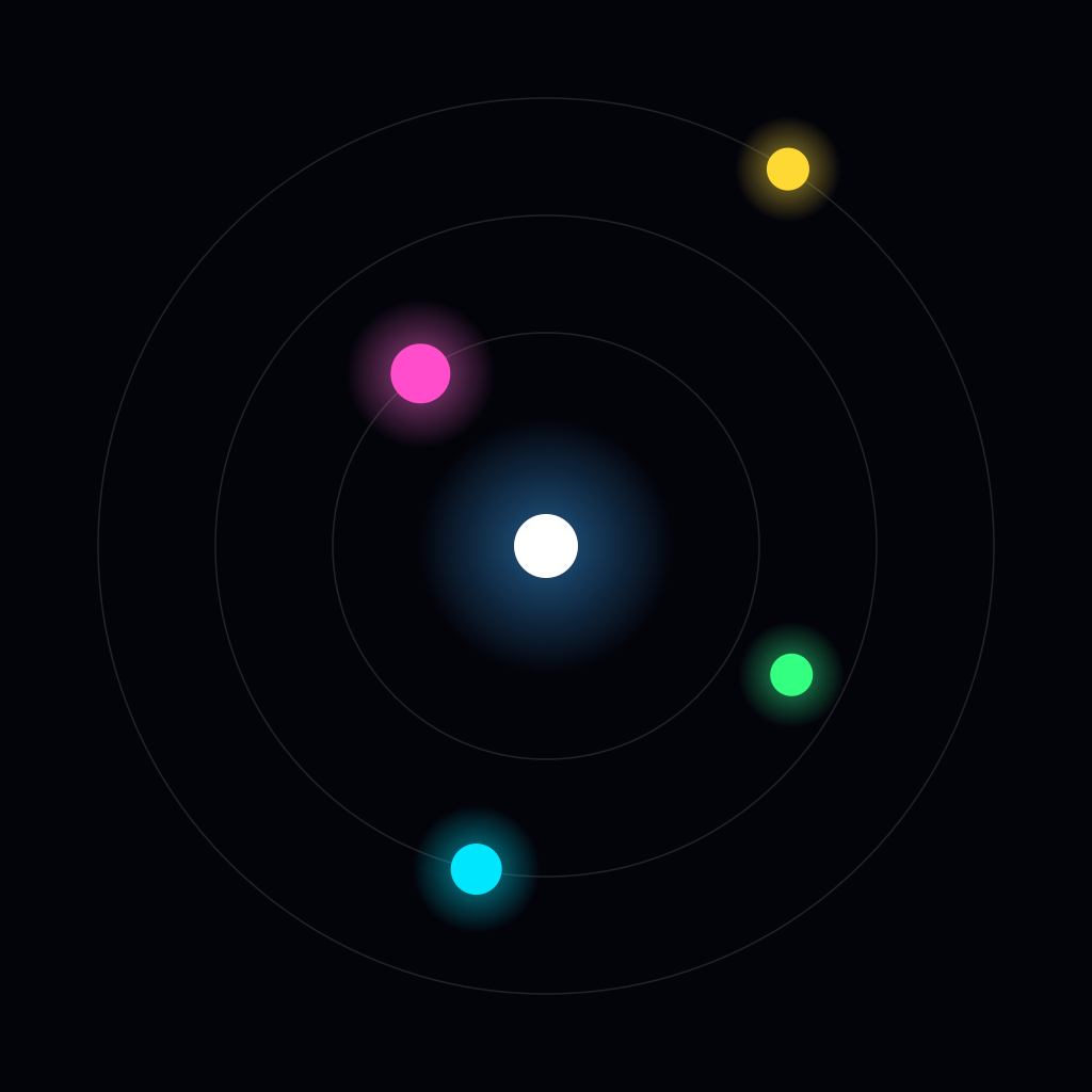 Synthwave universe with neon-blue star, glowing trails, and parallax starfield.